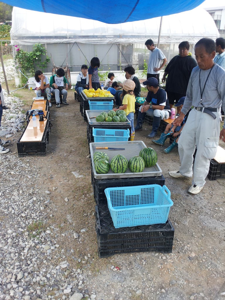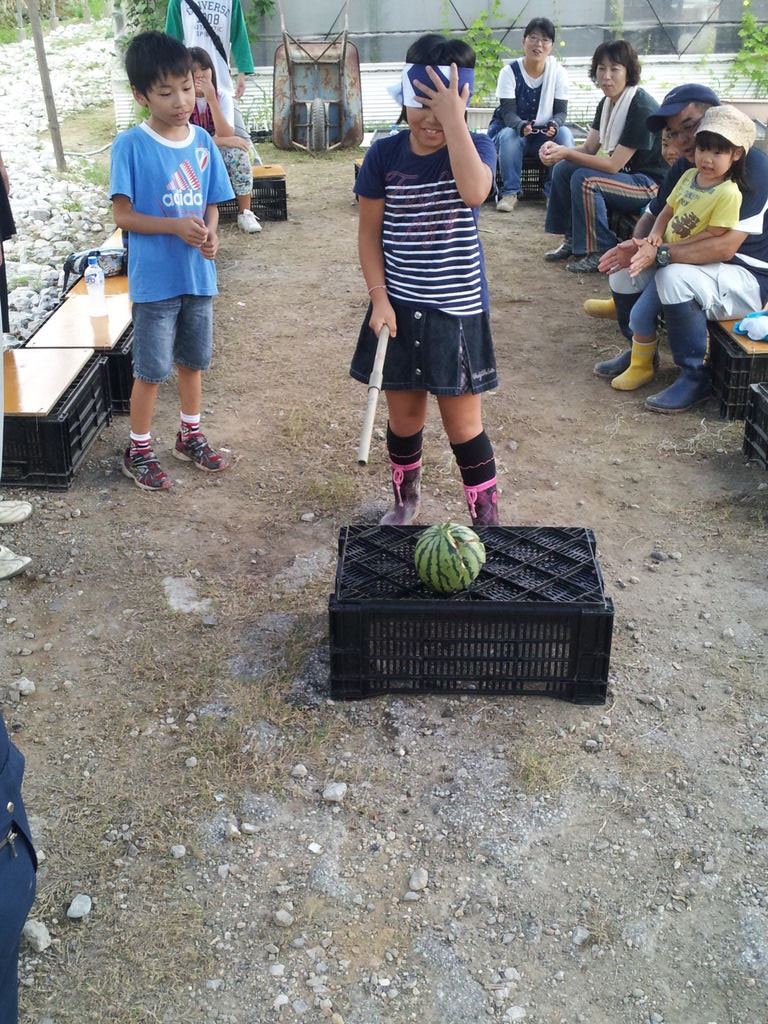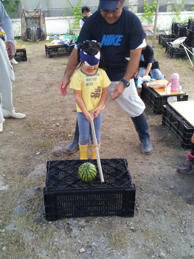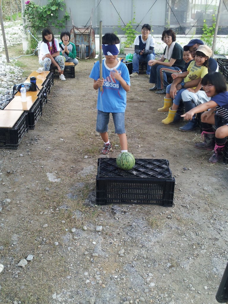 スイカ以外にもメロンの未熟なのも含め、スイカ割にもうみんな夢中です。延々と続くスイカ割でした。
